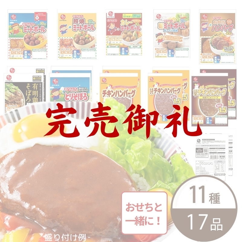 - 鶏肉(岩手県産)、たまねぎ、つなぎ(パン粉(小麦を含む)、でん粉)、砂糖、しょうゆ(大豆・小麦を含む)、食塩、しょうがペースト、醸造酢(小麦を含む)、なたね油、ソース(砂糖、有機トマトペースト(有機トマト(イタリア産))、醸造酢(小麦を含む)、みりん、しょうゆ(大豆・小麦を含む)、でん粉、食塩、香辛料)