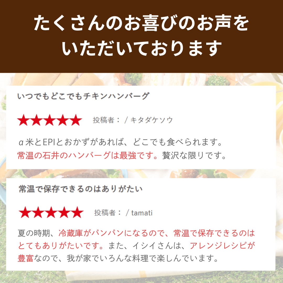 あのイシイのチキンハンバーグが、いつでもどこでも楽しめます。包装資材や殺菌方法を変えることで、常温での長期保存(お届け後約10~11ヶ月)を可能にしました。 もちろんこれまでと同じく、肉は国産鶏肉100%、乳成分・卵不使用、無添加調理です。