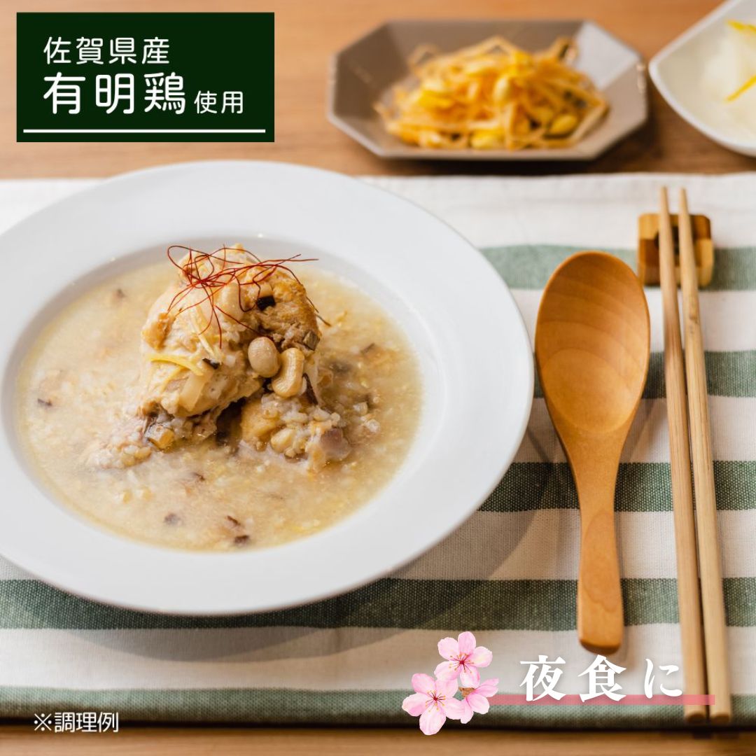 - 鶏肉(佐賀県産)、うるち玄米(国産)、しいたけ、大豆、しょうが、食塩、しょうゆ(大豆・小麦を含む)、ごま油、にんにく