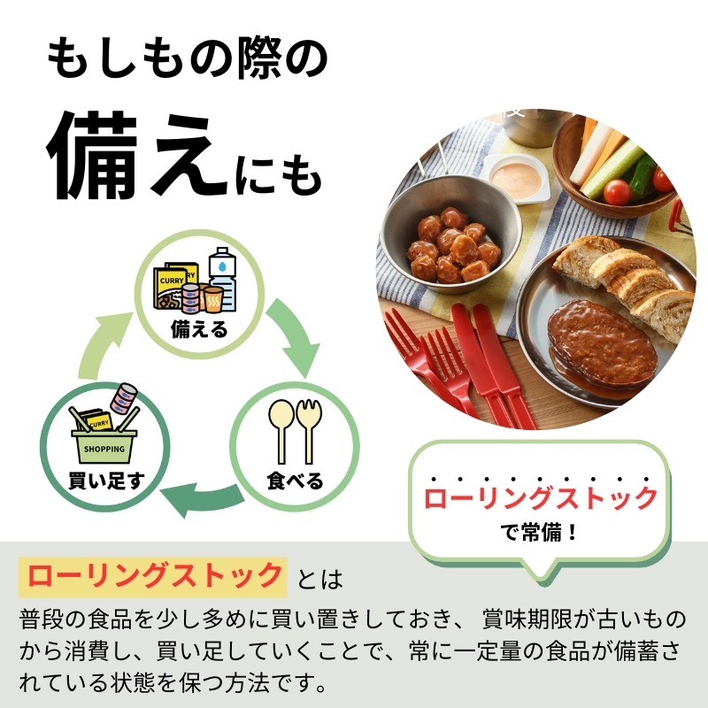 ローリングとは、食材を備蓄しながら定期的に食べて、食べたらその都度買い足す備蓄方法です。 賞味期限の管理がしやすく、食品を無駄にする心配がなくなるだけでなく、災害時に命を守ったり、いざという時に食べ慣れた味を食べることができるなどのメリットがあります。