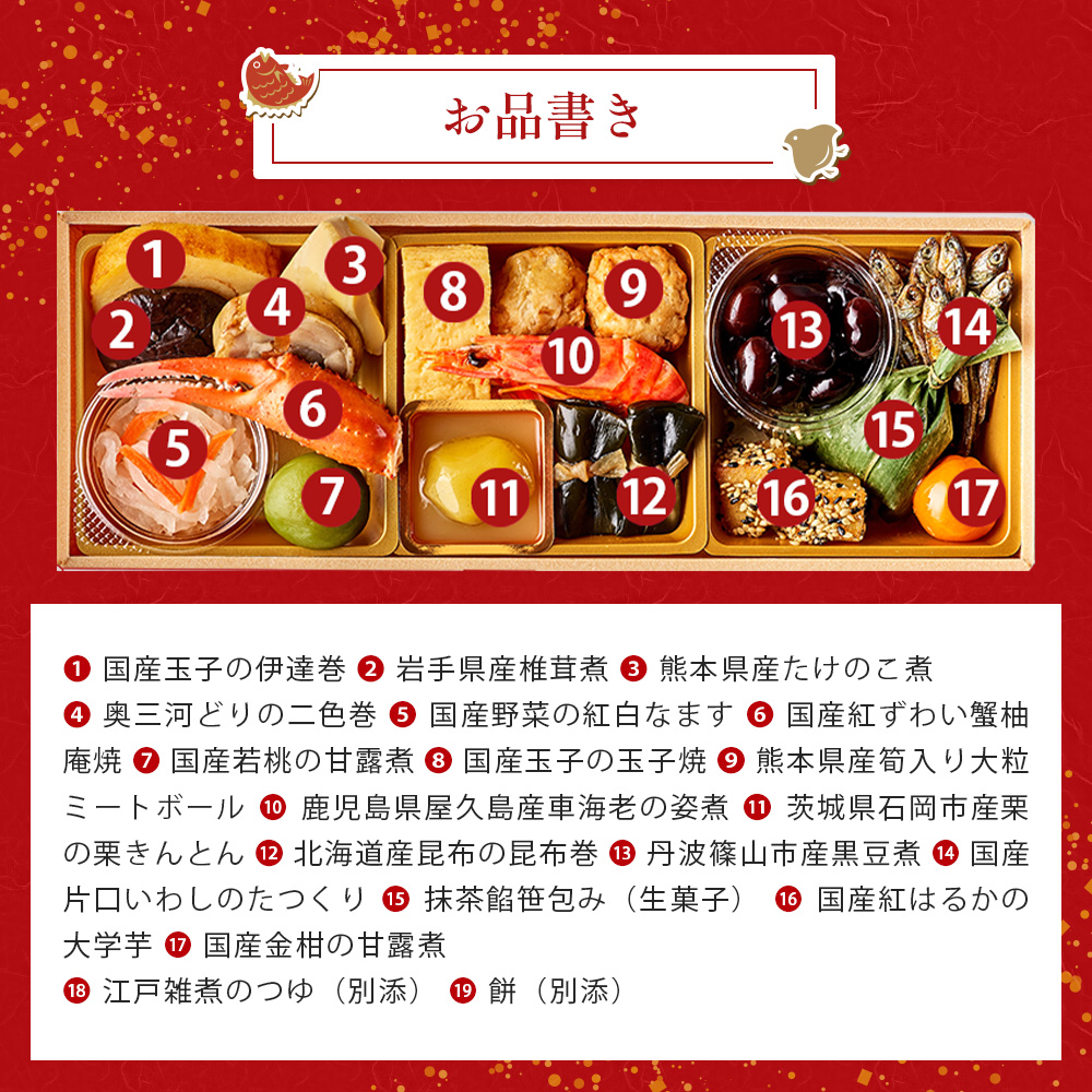 おせちに使う食材の主な原料は全て国産を使用。栗きんとんに使う栗などの原料だけでなく、だしに使う鰹節や昆布なども、全て国内製造または国産のものを使い、伝統的な和風おせちの味を追求しています。