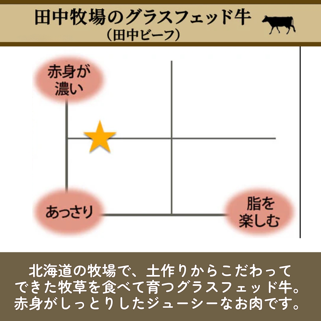 田中牧場のグラスフェッド牛「田中ビーフ」は、こだわりの草を食べて育った希少な牛で、年間生産数は12-24頭と言われています。飼料となる牧草は自家製有機肥料を作る所からはじまり、丹念に作りこまれた土壌で育った、高栄養価の牧草を与えています。 また、北海道の広大な土地で自由にのびのびと過ごすことで、臭みや脂身の少ない、上質な赤身肉となります。ご自分の子供のように大切に育てたグラスフェッド牛を、ぜひ生産者の想いを感じながら味わってみてはいかがでしょうか。