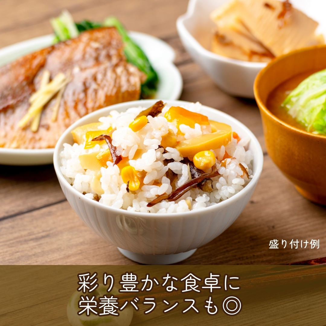 - 炊き上がったご飯(約2合)に本品(1袋)を調味液ごと混ぜてお召し上がりください。