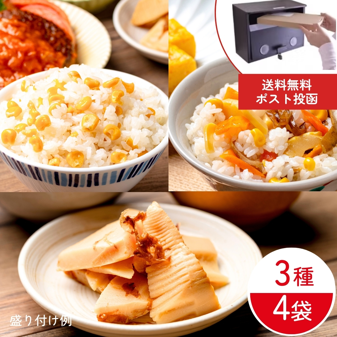 - 具材(とうもろこし、人参、たけのこ、ごぼう、きくらげ)、白だし(醤油、砂糖、その他)、本みりん、砂糖、食塩、(一部に小麦・さば・大豆を含む)