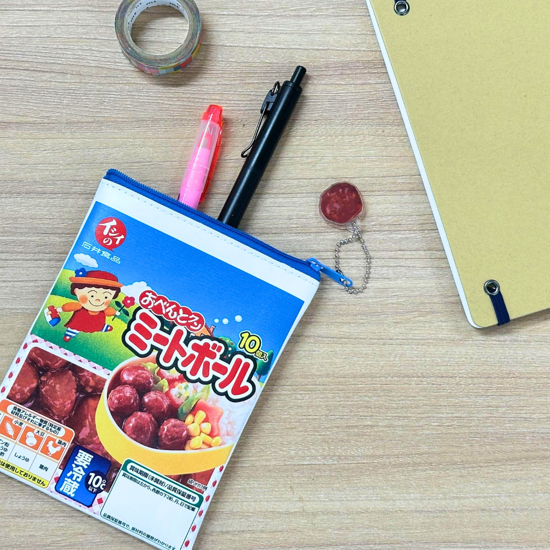 おべんとクンミートボール(トマト・カレー・照焼)、チキンハンバーグのパッケージデザインのポーチです。全種アクリルチャーム付き!