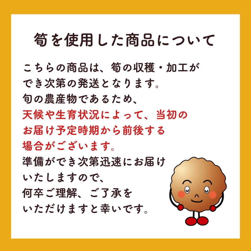 現在、生活様式の変化や安価な製品の輸入等により竹林・竹材利用の激減、管理してきた竹林所有者の高齢化や後継者不足等に伴い管理されない放置林が急増し社会問題になっています。石井食品では、この国産の筍のおいしさや日本の伝統を絶やさないためにも旬の筍を使った商品づくりを今年も変わらず続けてまいります。筍農家のみなさまの想いの詰まった筍を存分にお楽しみください。