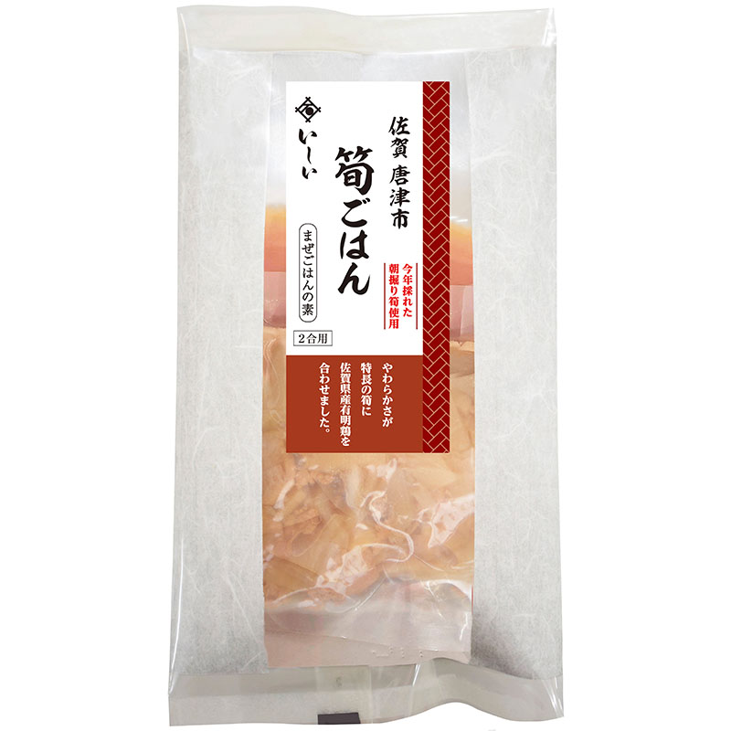 - 【まぜごはんの具】筍水煮(筍(佐賀県唐津市産))、鶏肉(佐賀県産)、しょうゆ(大豆・小麦を含む)、みりん、清酒、なたね油、鶏がらスープ、片口いわし