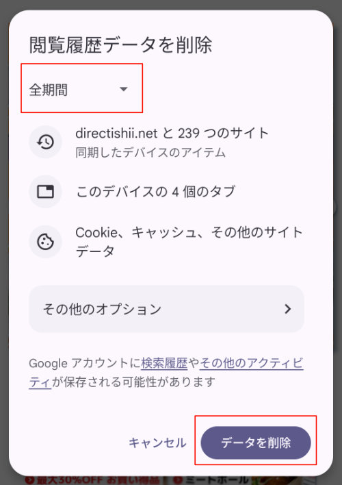3. 「全期間」を選択し、「データを削除」を選択します。