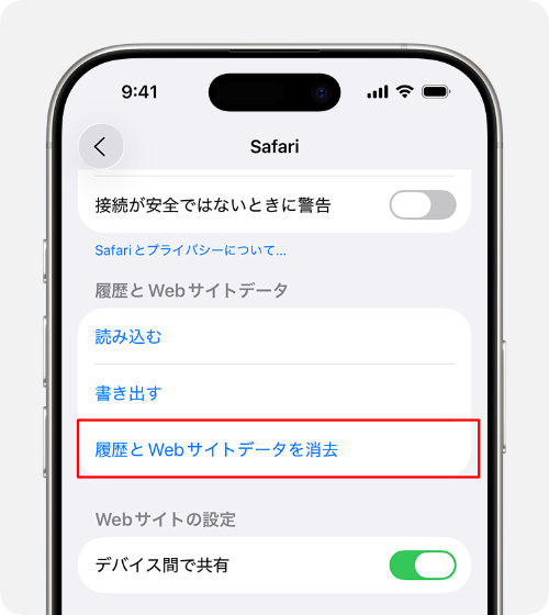 1. 「設定」>「アプリ」>「Safari」の順に選択します。2. 下にスクロールし、「履歴とWebサイトデータを消去」を選択します。