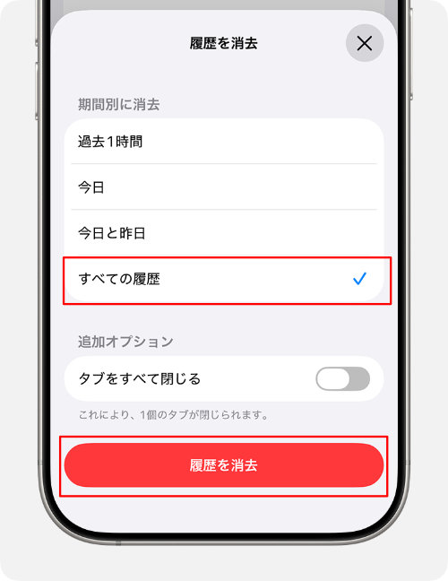 3. 「すべての履歴」を選択し、「履歴を消去」を選択します。