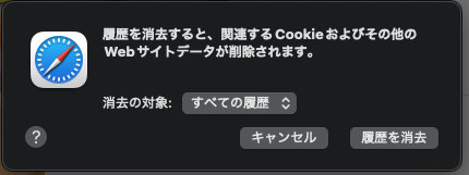 1. 「Safari」>「履歴の消去」を選択します。2. 消去の対象を「すべての履歴」を選択し、「履歴を消去」を選択します。 3. 消去処理が開始されます。